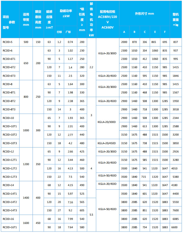 四、RCDD系列懸掛帶式自冷電磁除鐵器主要技術(shù)參數(shù)、外形尺寸             執(zhí)行標(biāo)準(zhǔn):JB/T7689