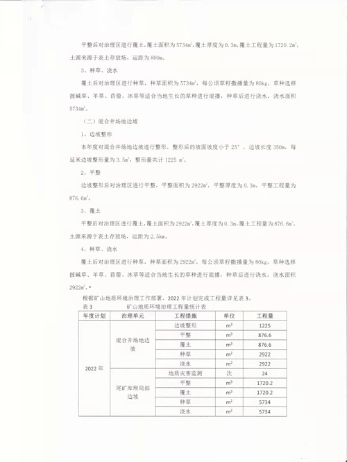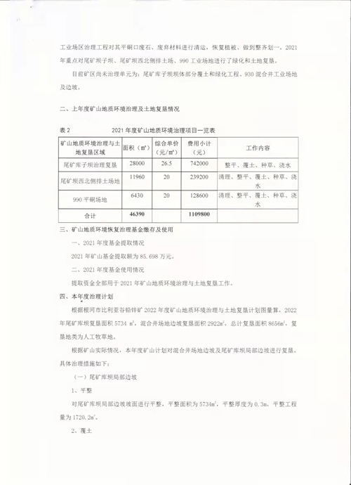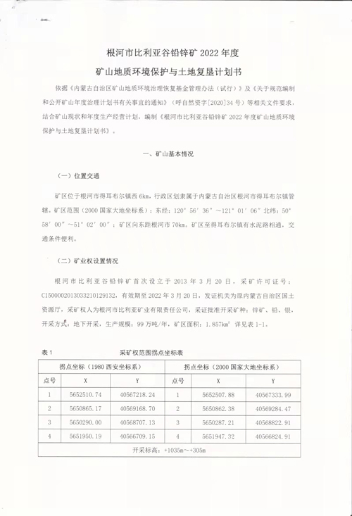 依據(jù)《內(nèi)蒙古自治區(qū)礦山地質(zhì)環(huán)境治理恢復(fù)基金管理辦法(試行)》及《關(guān)于規(guī)范編制和公開礦山年度治理計劃書有關(guān)事宜的通知》(呼自然資字[2020]34號)等相關(guān)文件要求,結(jié)合礦山現(xiàn)狀和年度生產(chǎn)經(jīng)營計劃,編制《根河市比利亞谷鉛鋅礦2022年度礦山地質(zhì)環(huán)境治理保護與土地復(fù)墾計劃書》并在企業(yè)門戶網(wǎng)站上進行公示,公示信息如下: